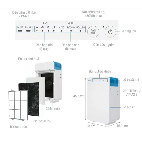 - Chế độ Econo (tiết kiệm điện năng): Thiết bị vận hành tự động chuyển đổi giữa chế độ "Yên tĩnh" và "Thấp" theo mức độ ô nhiễm không khí, đảm bảo lọc tốt mà không gây hao phí năng lượng điện.